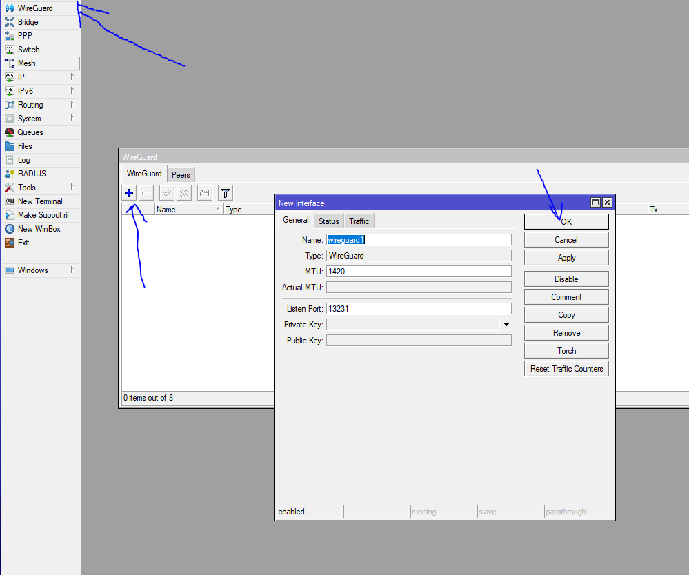 Na criação da interface wireguard o mikrotik vai criar uma chave privada e uma chave publica. O que interessa é a chave publica. Na aba Peers é onde acontece a mágica.